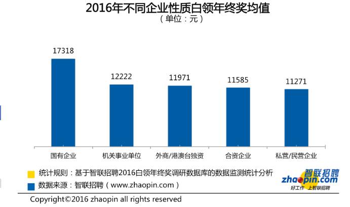 同时,调查指出,和2015年的数据相比,国有企业白领对年终奖的满意度提升最大,以2.46的指数跃居第一。其次是外商/港澳台独资企业白领,满意度指数为2.43。在私营/民营企业就职的白领对年终奖的满意度水平依旧最低,满意度指数仅为2.07。