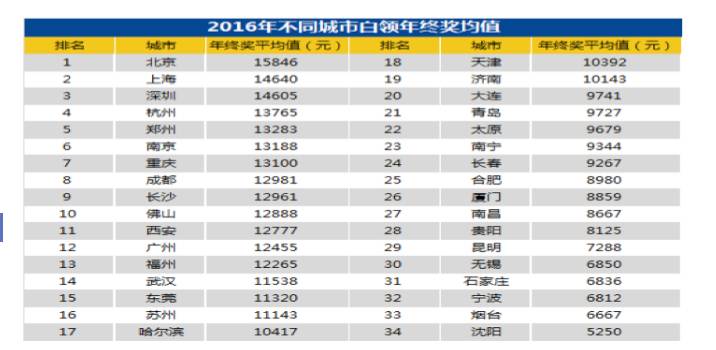 从不同城市来看,北京的年终奖均值最高,为15846元,上海、深圳和杭州位列第二、第三和第四,分别为14640元、14605元和13765元。