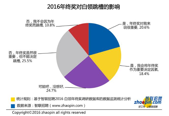 年终奖对白领下一年度的职业变动仍有一定影响。当被问及是否会因为年终奖发放情况而选择跳槽时,39%的白领明确表示是重要因素,但也有36.3%的白领表示年终奖不会决定跳槽,此外有24.7%的白领表示不确定。对比2015年的调查结果发现,年终奖对白领跳槽的影响程度处于上升趋势。
