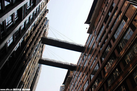 重庆渝中区临江门附近一家新建楼盘上,悬空架起了两座悬空天桥,天桥离地68.5米,22层楼高,让过往市民心惊肉跳,被称为“最牛悬空天桥”。何渝/东方IC