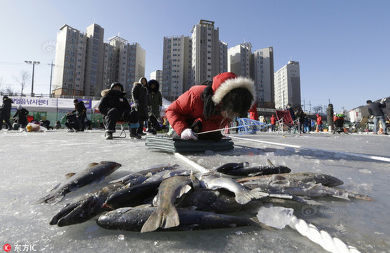 韩国冰雪节超百万人参加 民众赤手抓鱼