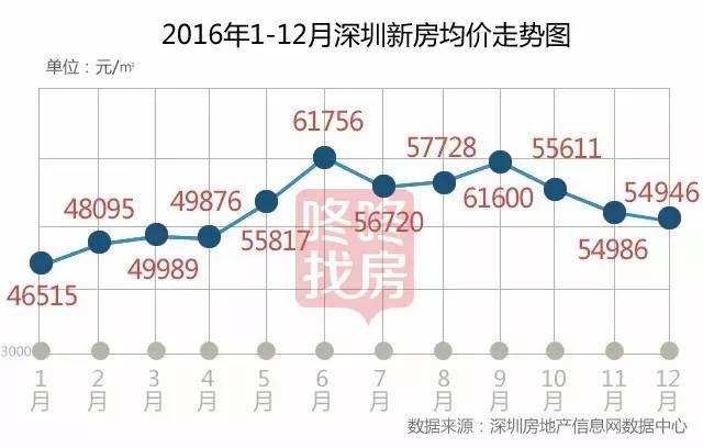 上涨、冲高、振荡、回调……,2016年,高房价的深圳楼市上演了一场惊心动魄的过山车行情,1-9月份,深圳房价螺旋式攀升上涨,其中6月和9月房价突破6万元,进而引发104最严调控新政的出台,新政威慑下的深圳房价显著回落,10-12月房价在55000元上下波动。纵观全年,2016年深圳新房住宅成交均价53454元/㎡,同比上涨59.9%。