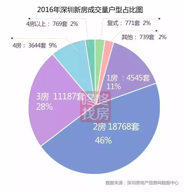 2016年,深圳全市共成交40443套新房住宅,2房成交18768套,占总量的46%;其次是3房,成交11187套,占总量的28%。
