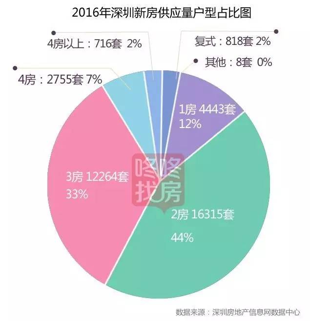 2016年,深圳预售户型供给量37319套,其中2房供应量16315套,占总量的44%;3房供应量12264套,占总量的33%。