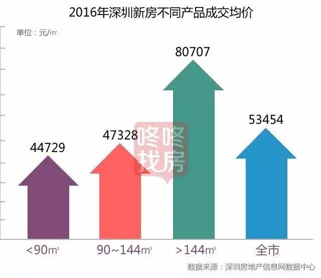 2016年小户型产品90㎡以下的户型整体成交均价44729元;改善型产品90~144㎡户型的整体成交均价47328元;大户型产品144㎡以上的户型整体成交均价80707元。