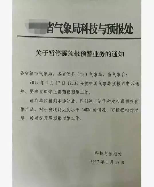 “各省辖市气象局,各直管县(市)气象局,省气象台:2017年1月17日18:36分接中国气象局预报司电话通知,要求立即停止霾预报预警工作。请各单位接到本通知后,即刻停止制作和发布霾预报预警产品。对于出现能见度小于10KM的情况,可根据相对湿度,按照雾开展预报预警工作”,落款人为“科技与预报处”。