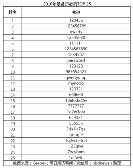 下面是每经小编(微信号:nbdnews)Keeper发布的数据整理出的2016年最常用密码TOP25榜单: