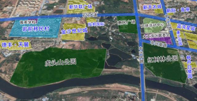 虎头山公园位于红树林公园西面,其北面是岩前移民村,还有在售楼盘金沙世纪城。