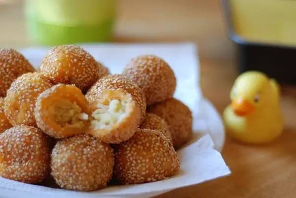 既然说到了钵仔糕当然少不了煎堆咯,毕竟小时候到买早餐也会买到,现在的早餐店也会看见它的身影,有些地方也叫麻球、麻团、珍袋等等。内馅,外皮都是不同的口味,表面有很多芝麻的, 薄脆清香,内里甜糯。