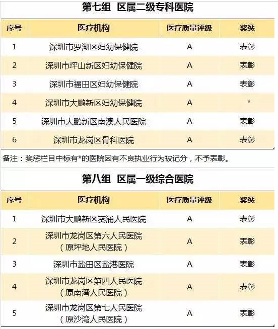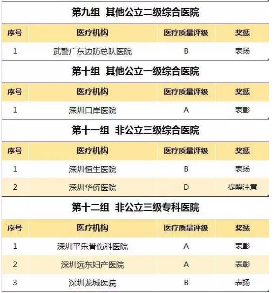 深圳市龙岗区妇幼保健院等21家评为B级医疗质量且无不良执业行为记录的单位被通报表扬。