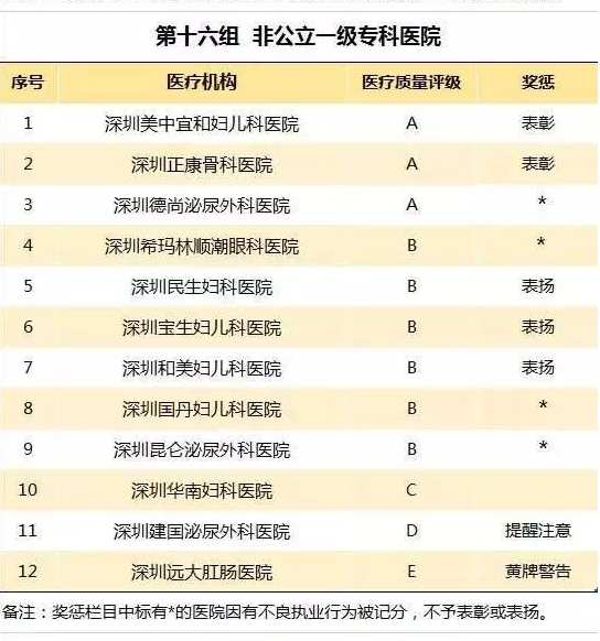 本年度被评为E级医疗质量的深圳华丹医院、深圳流花医院、深圳远大肛肠医院等3家医院及2015年、2016年连续两年评为D级的深圳六联医院被黄牌警告。