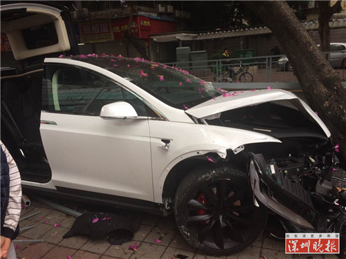 1 月 19 日上午 8 点多,罗湖区桂园北路一辆价值 100 多万的白色特斯拉 SUV 撞倒栏杆,冲上了人行道,并撞上路边一棵大树,车头严重损毁。所幸无人员伤亡。