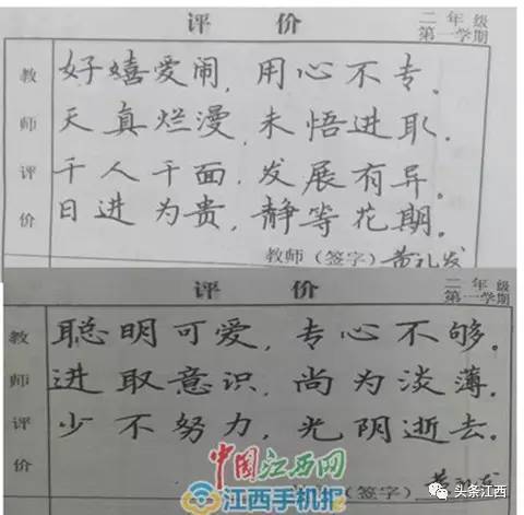 又是一年寒假到,众位同学和家长们,都拿到了学生素质报告了吧?老师的期末评语是什么呢?各位家长们,你们还记得您自己上学时老师给的评语吗?众所周知,期末评语是一项规定动作,真可谓“年年期末年年写,年年岁岁话相似”。最近两天江西赣县一位小学老师的四字评语,却颠覆了人们对老师评语的刻板印象,瞬间刷屏朋友圈!