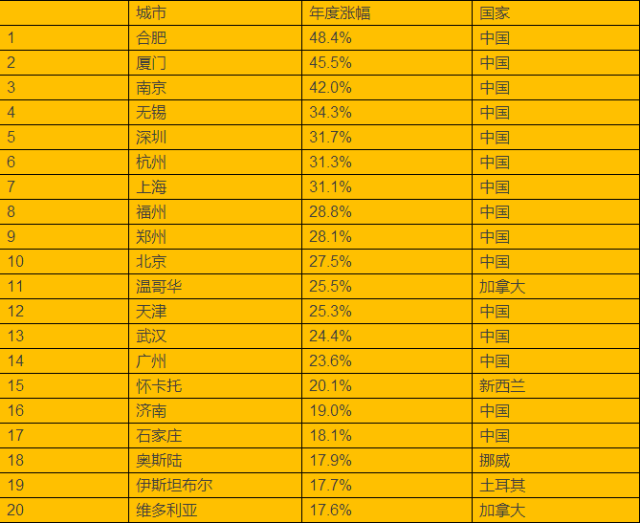 “2017全球房价指数”显示,全球房价年度涨幅前十名均是中国大陆城市,合肥、厦门、南京排名前三。