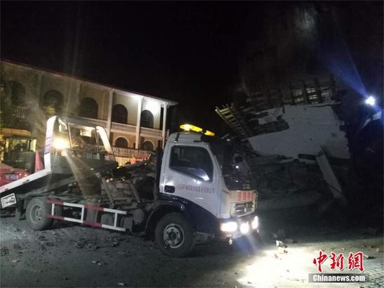 据湖北襄阳市南漳县官方消息,20日晚7时30左右,南漳县城关镇便河村三组海市蜃楼酒店背后突发山体滑坡自然灾害,将该酒店部分房屋掩埋。钟欣 摄