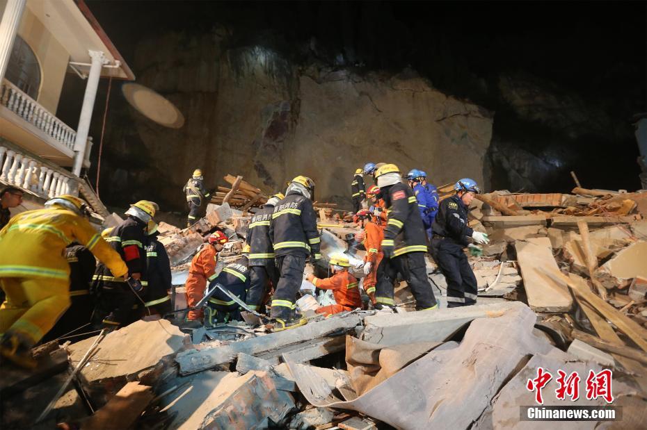通报称,21日中午在救援时,发现废墟中有一重约150吨的巨石,影响了整个救援和除险工作。同时,发现危岩裂缝有扩大迹象。消防供图