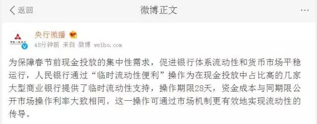 20日下午,央行宣布,为保障春节前现金投放的集中性需求,促进银行体系流动性和货币市场平稳运行,人民银行通过“临时流动性便利”操作为在现金投放中占比高的几家大型商业银行提供了临时流动性支持,操作期限28天,资金成本与同期限公开市场操作利率大致相同。这一操作可通过市场机制更有效地实现流动性的传导。