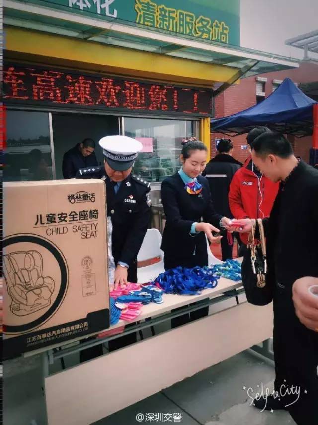 (一)粤北探路组在清连高速北行清新服务区和清远交警、清连高速公司联合开展交通宣传活动。现场派发深圳交警交通宣传品,和很多热心的深圳车友及其他返程车友互动。在服务区看到一辆深圳牌照小车从深圳前往贵州,带着两岁的小盆友,蜀黍立即想到了安全座椅,车主认为抱着小孩很安全,蜀黍赶紧纠正错误的安全意识,并现场赠送一套儿童安全座椅。