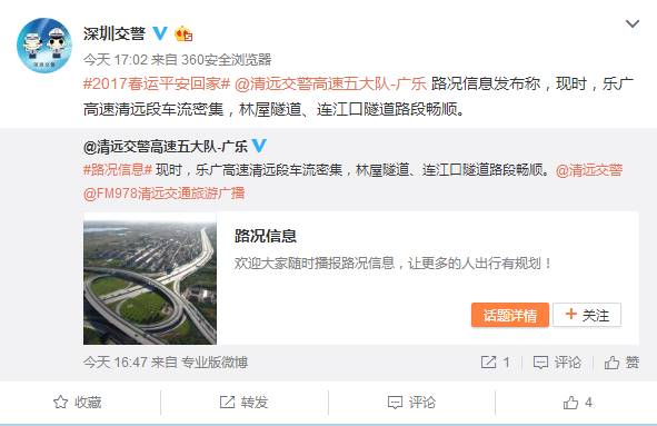 @深圳交警官方微博联合深圳交警各单位、各辖区大队以#2017春运平安回家#为微博主题,每天实时发布我市及邻近我市高速公路的天气状况、路面情况、车流量、路面施工和交警温馨提示。