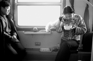 1995年,从齐齐哈尔开往北京的列车上,一位女青年吃着的康师傅方便面同时吸引了旁边的男人和宠物狗。