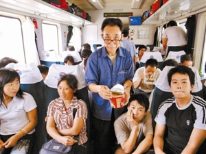 一帮来自辽宁丹东的大叔准备了整箱的方便面和整箱的啤酒,陪伴他们度过37小时的漫长旅程。因为价格便宜,他们选择以方便面为主食,以花生、鸡爪为零食,以酒助兴,在飞驰的列车上共享“流动的盛宴”。