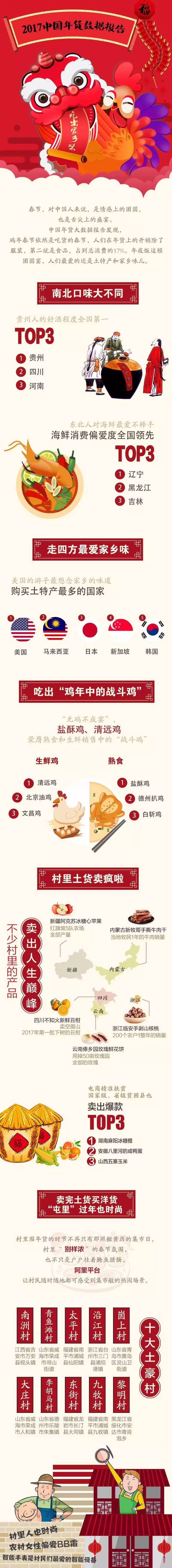 一年一度的年夜饭,不仅是除夕的一顿晚餐,更承载着一家人团聚的期盼。中国年货大数据报告显示,鸡年春节,食品依然是仅次于服装的第二大年货,并且在年货消费中占比逐年提升,从2015年约14%一路攀至2017年17%。而吃货置办年货,最爱的依然是土特产和家乡味。