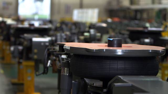 这是中车自主研发的空气弹簧。外形有点像轮胎,一个转向架需要两个这样的空气弹簧。在高速运行的列车上竖一枚硬币,之所以不倒,这其中就有空气弹簧的功劳。它最外层的橡胶至少要能承受住30多吨的车厢压力,确保人在车上感受不到明显的震动。