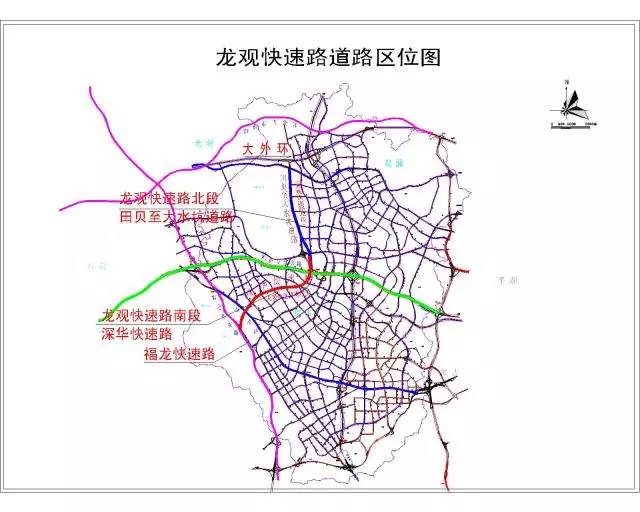 龙澜大道北段,包括主线和支线工程,主线南北走向,北起观光路,南至观天路路口与龙澜大道(南段)衔接,全长4.99km。按城市快速路设计,设计行车速度主道80km/h,辅道40km/h,红线宽80米。支线为观天路,呈东西走向,西起龙观交叉口,东接现状观澜大道平交路口,全长1.08km,按城市I级主干道设计,双向6车道,路幅宽60m,分3个标段实施。