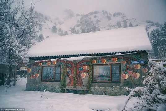 在20年前,Kazina辞掉工作后带着自己的两个孩子搬到俄罗斯阿尔泰边疆区居住,这里的小木屋没有暖气和厕所,甚至没有自来水。Kazina用自己的桃树壁画装饰屋子。