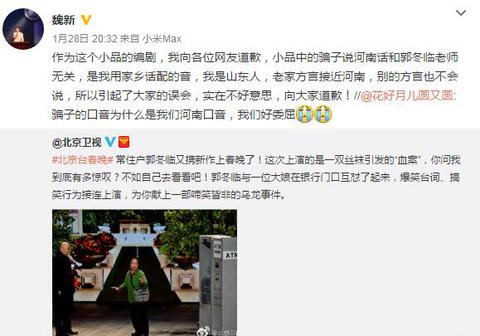 对此,该小品编剧魏新在微博上回应,“作为这个小品的编剧,我向各位网友道歉,小品中的骗子说河南话和郭冬临老师无关,是我用家乡话配的音,我是山东人,老家方言接近河南,别的方言也不会说,所以引起了大家的误会,实在不好意思,向大家道歉!”(
