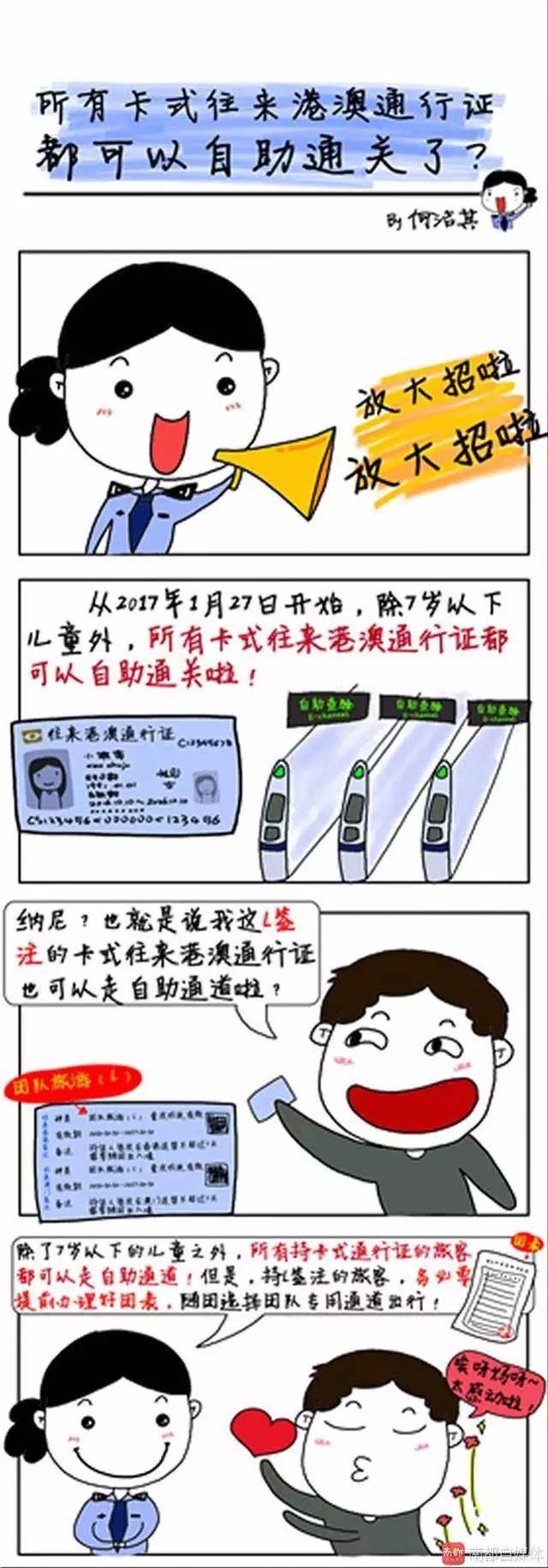 何洁其说,“L签”的卡式电子往来港澳通行证在大年三十当天就可以走自助通道通关了。但在春节假期上班时间,她常常遇到大批旅行团在人工验放通道排起长龙,自助通道却空空如也的现象,虽然每次都会提醒旅客下次可以直接从自助通道通关,但传播力度有限,因此萌发了制作漫画的念头告知广大出入境旅客,让这项便民措施惠及更多旅客。
