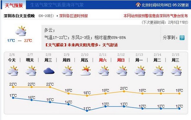 深圳新闻网讯 鹏城昨日温暖舒适,多数区域最高气温升至23℃左右。市气象台预测,未来几天,阳光增多,早晚清凉,白天舒适。近来天气变化依旧较快,市民应注意预防疾病。