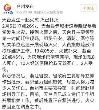记者从天台县委宣传部了解到,2月5日下午17点26分,天台县赤城街道春晓堤足馨堂发生火灾。接到火警之后,天台县主要领导第一时间赶往现场,组织公安、消防、医疗等相关单位迅速开展现场灭火、人员搜救疏散和秩序维护工作。19点05分,火被扑灭。截至20点45分,火灾现场已清查完毕,现场发现8人死亡,10人送经医院抢救无效死亡,2人受伤。
