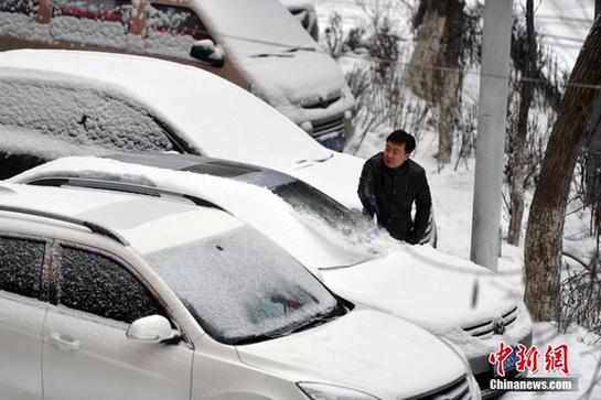2月5日,强冷空气入侵新疆北部,多地出现降雪降温天气,首府乌鲁木齐4日晚23时开始降雪,截至目前降雪仍在继续。新疆气象台5日消息称,乌鲁木齐市今天白天到夜间大到暴雪,最高气温零下7摄氏度,最低气温零下12摄氏度。清晨,记者途经主城区多个商业圈,行人在雪中小心翼翼行走,道路上车辆缓慢行进,城市建筑物已被积雪覆盖。新疆气象台2月3日13时发布的寒潮蓝色预警信号继续有效。降雪给乌鲁木齐环卫工人及市政清雪力量带来压力,大中型清雪车辆不间断清雪,道路上环卫工人不停歇忙碌着,只为确保道路通行顺畅。图为市民为爱车清理积雪。刘新摄