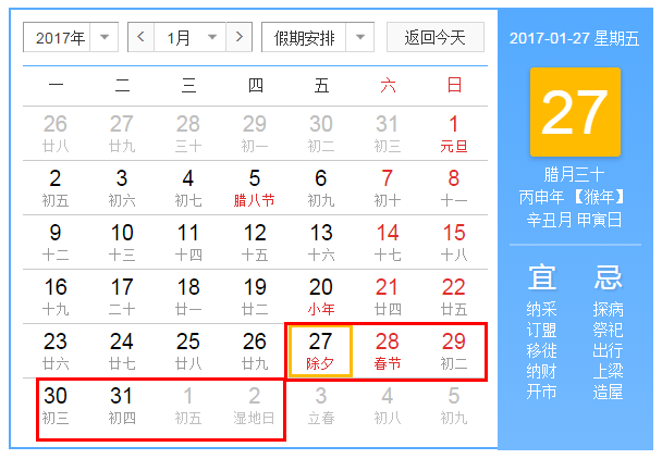 按国务院放假规定,2017年春节从1月27日至2月2日,共放假7天。这7天,初一、初二、初三是法定节假日,另外四天则不是。
