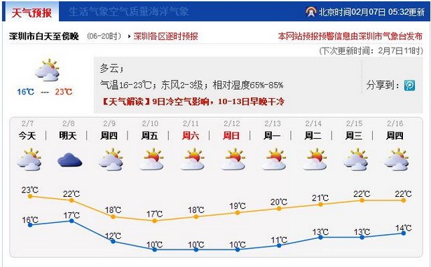 期间深圳天气以晴到多云为主,2月14日起冷空气减弱气温逐日回升