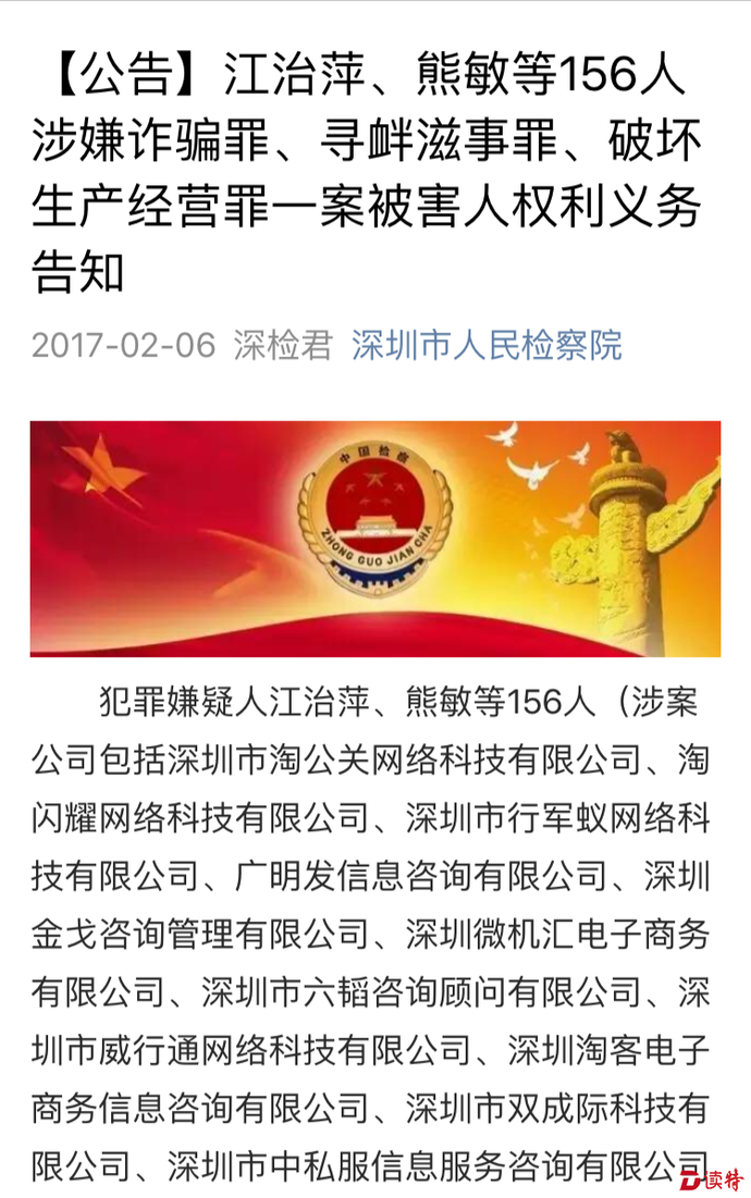 深圳市检察院通过官方微信平台发布的公告称,犯罪嫌疑人江治萍、熊敏等156人(涉案公司包括深圳市淘公关网络科技有限公司、淘闪耀网络科技有限公司、深圳市行军蚁网络科技有限公司、广明发信息咨询有限公司、深圳金戈咨询管理有限公司、深圳微机汇电子商务有限公司、深圳市六韬咨询顾问有限公司、深圳市威行通网络科技有限公司、深圳淘客电子商务信息咨询有限公司、深圳市双成际科技有限公司、深圳市中私服信息服务咨询有限公司等公司)涉嫌诈骗罪、寻衅滋事罪、破坏生产经营罪一案,已于2017年2月4日报送该院审查起诉。该案涉案人数众多,现告知本案被害人有权委托诉讼代理人,在审查起诉阶段享有的权利义务(该权利义务告知书同时在深圳市检察院检务大厅公告栏公告)。