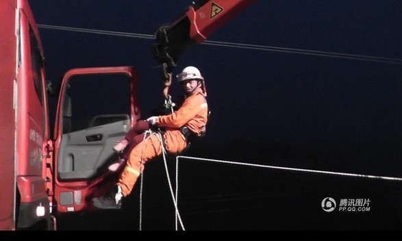 重庆大货车失控冲到悬崖边 消防“悬空”救人