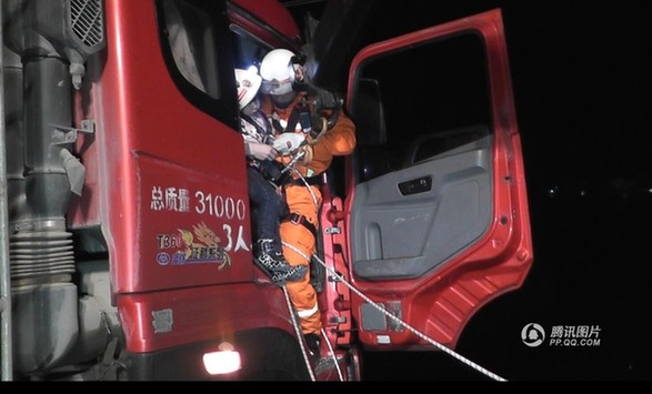重庆大货车失控冲到悬崖边 消防“悬空”救人