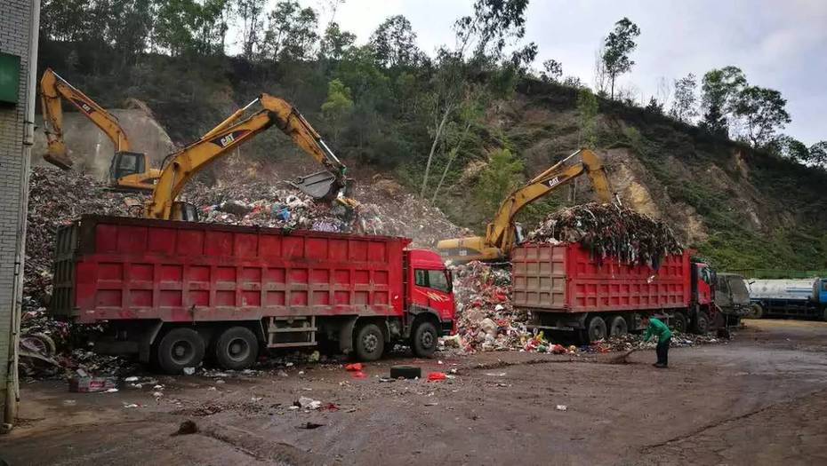 今天,垃圾站清理工作还在持续,现场有三台挖掘机以及多部大货车正在来回加紧作业,有环卫工人在一旁帮忙清理。