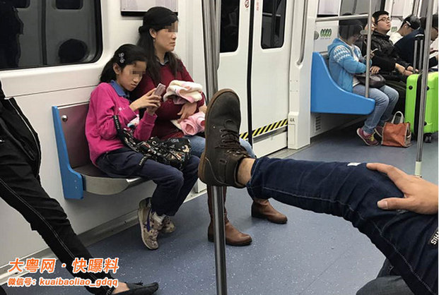 2月7日深圳伍先生向“快曝料”微信号报料称,下午7时30分,他在开往双龙方向的地铁3号线列车上,看到一长腿欧巴搂着旁边的女孩子肆无忌惮“秀”长腿。伍先生介绍称,这两人从石厦站上车,一上来这位小伙子就把腿蹬在扶手柱上。