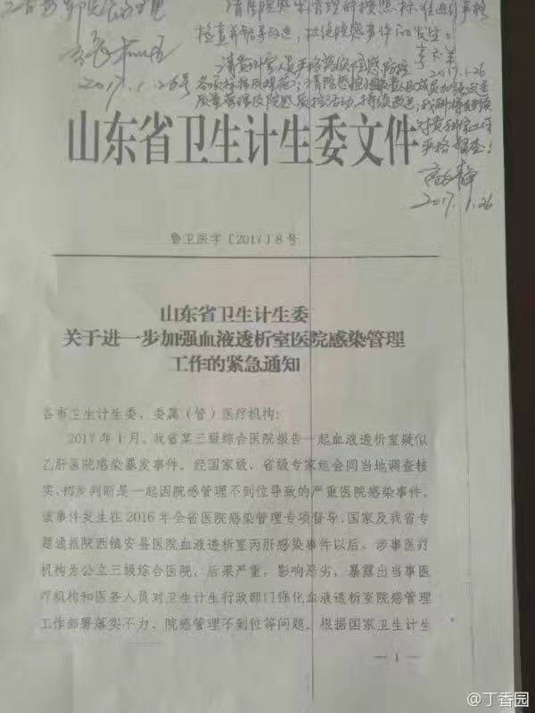 2月9日,一份题为《山东省卫生计生委关于进一步加强血液透析室医院感染管理工作的紧急通知》首页复印件在网上流传,图片显示该文件编号为“鲁卫医字[2017]8号”。