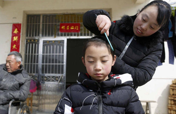 2017年2月9日,安徽省岳西县石关乡,下午一时许,汪义华将家中收拾整洁后,在暖阳下给板着小脸的女儿梳理头发。汪义华说,腊月二十五回家后,女儿每天晚上都搂她睡,每天给她梳头,小家伙做梦都在笑。
