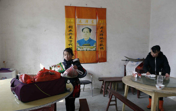 2017年2月9日,安徽省岳西县石关乡,午饭后,露露帮助妈妈收拾东西,悄悄将妈妈最爱吃的山里干菜塞进行礼包。照真达俗/视觉中国