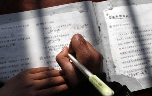 2017年2月9日,安徽省岳西县石关乡,小露露一直寻找排解心中情感的方式,在外面绕了几圈,她又回到屋内做作业,冻裂的小手、紧握的笔,也掩饰不了她内心的挣扎。上五年级的小露露成绩非常好,在班上名列前茅。