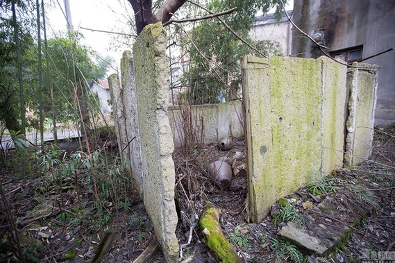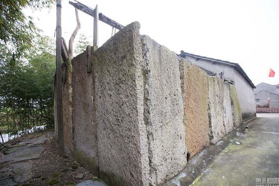 2017年2月5日,浙江省上虞市沥海镇四联村,走在路上,随处可见这种不同寻常的房子。这些房子破旧不堪,基本只剩房子的“框架”。这是用墓碑做的房子,有的墓碑刻着“民国”、“清”等字样的碑文,看来距今至少已有100多年。