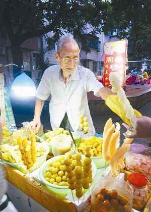 与其他摊贩不同,在沙河街西部牛仔店前卖腌水果的陈伯,却从不吆喝,因为他在这已驻扎了 18 年,来往的街坊都常来帮衬。