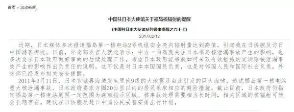 2月12日,中国驻日本大使馆发布关于福岛核辐射的领事提醒:“近期,日本媒体多次报道福岛第一核电站2号机组安全壳内辐射量达到高值,建议在日侨胞及赴日中国公民妥善安排出行计划。”