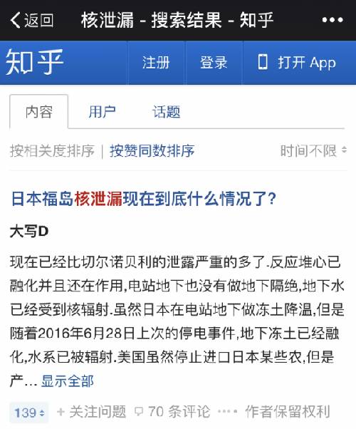 虽然对FDA的最新“禁令”解读显然值得商榷,但人们对于日本核辐射真相的担忧却有增无减。比如,在“知乎”上查询“日本核泄漏”,得到的回答是“现在已经比切尔诺贝利的泄露严重得多了”。