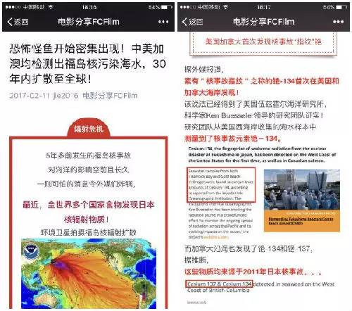 再比如,这两天,有微信公众号发帖称“恐怖怪鱼开始密集出现!中美加澳均检测出福岛核污染海水,30年内扩展至全球”,“素有‘核事故指纹’之称的铯-134首次在美国和加拿大海岸被发现!”